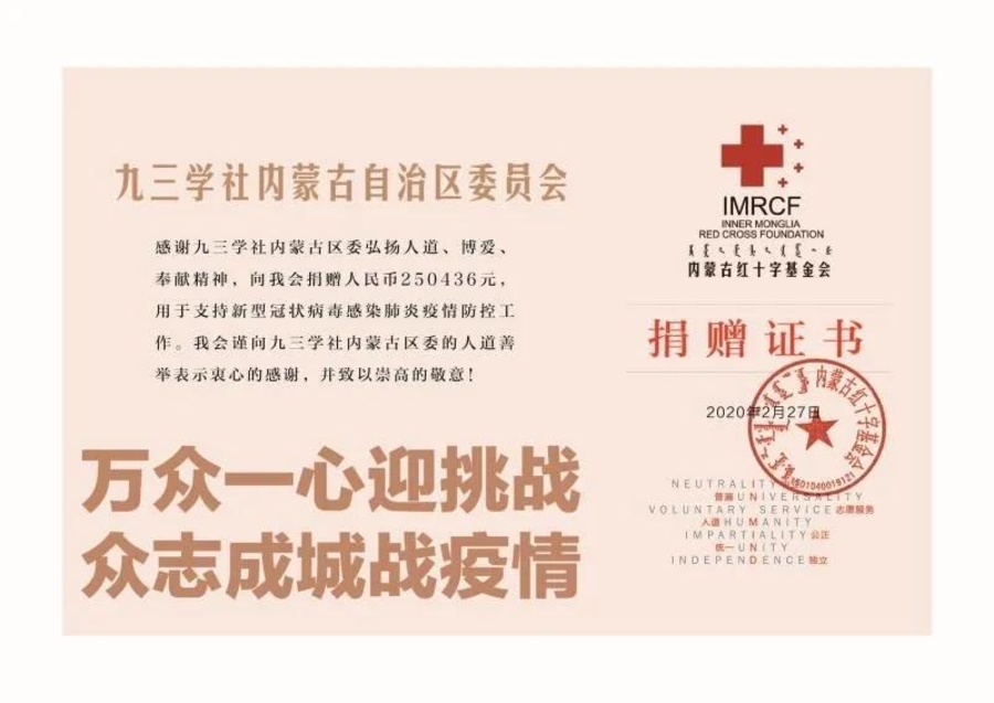 3月2日,九三學(xué)社內(nèi)蒙古區(qū)委專職副主委劉德代表全區(qū)各級(jí)組織和廣大社員,向內(nèi)蒙古紅十字基金會(huì)捐贈(zèng)了愛心善款,定向用于全區(qū)疫情防控工作。
