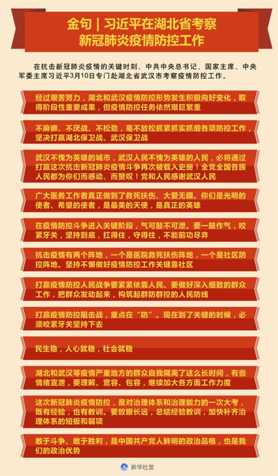 習(xí)近平指出,在這場(chǎng)嚴(yán)峻斗爭(zhēng)中,湖北各級(jí)黨組織和廣大黨員、干部沖鋒在前、英勇奮戰(zhàn),全省醫(yī)務(wù)工作者和援鄂醫(yī)療隊(duì)員白衣執(zhí)甲、逆行出征,人民解放軍指戰(zhàn)員聞令即動(dòng)、勇挑重?fù)?dān),廣大社區(qū)工作者、公安干警、基層干部、下沉干部、志愿者不懼風(fēng)雨、堅(jiān)守一線,廣大群眾眾志成城、踴躍參與,涌現(xiàn)出一大批可歌可泣的先進(jìn)典型和感人事跡。