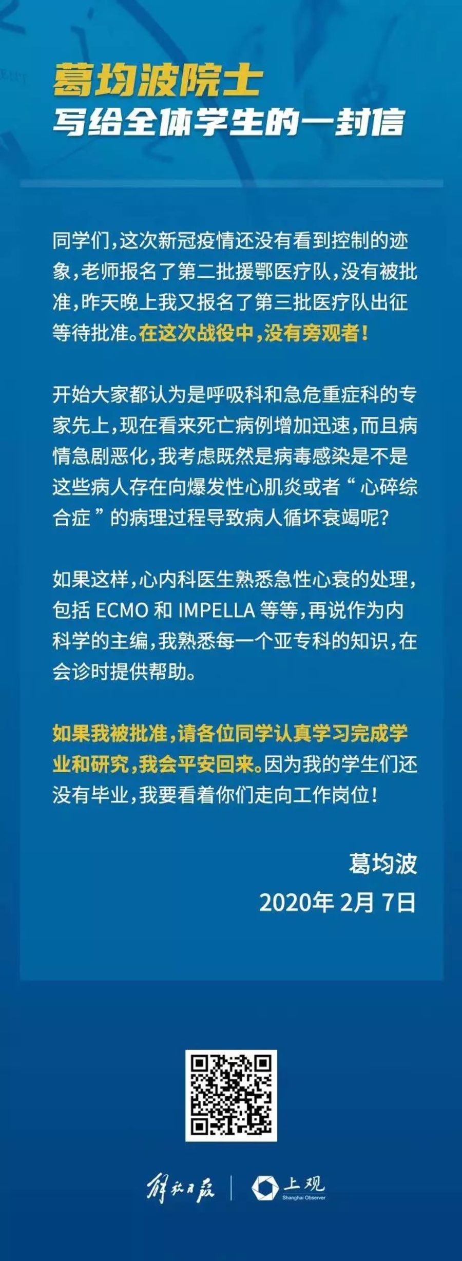 2月7日,中科院院士、復(fù)旦大學(xué)附屬中山醫(yī)院心內(nèi)科葛均波教授的“寫給全體學(xué)生一封信”,在朋友圈內(nèi)傳開。解放日報(bào)·上觀新聞?dòng)浾哌B線葛均波院士本人,“作為醫(yī)生,國家有難,我有責(zé)任有義務(wù)挺身而出。”