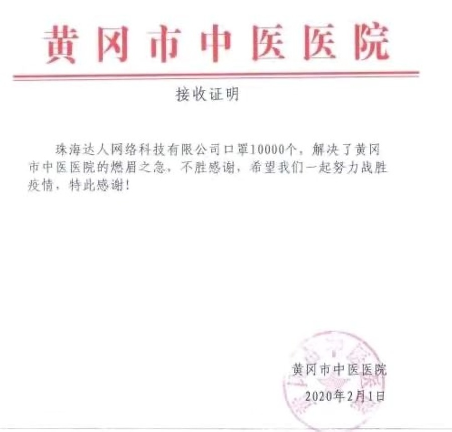 社員張裕生企業(yè)珠海達(dá)人網(wǎng)絡(luò)科技有限公司向黃岡市中醫(yī)醫(yī)院捐贈口罩10000個。