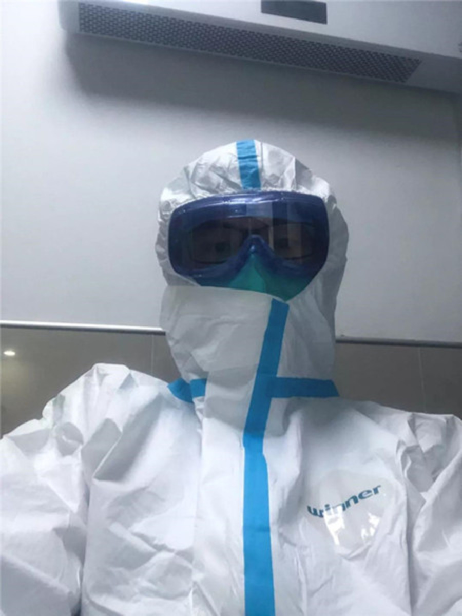 1月20日8時—1月21日8時,響應同濟醫(yī)院放射科發(fā)熱門診輪轉安排,我進入一線參與了疫情大爆發(fā)后發(fā)熱門診第一個CT24小時值班,我們工作人員進入崗位必須穿戴全套隔離裝備,每個人表情都很凝重,大部分人員也是第一次穿戴隔離設備,但是每個人都按照操作要求一絲不茍的穿隔離衣,戴口罩。氣氛緊張,薄薄的一層隔離并無法消除每個人內心的恐慌,雖然我也有自己的家庭,也有年幼的孩子,但我更是一名處在一線的醫(yī)技工作者,這個時候,我們必須站出來,為人民群眾保駕護航。