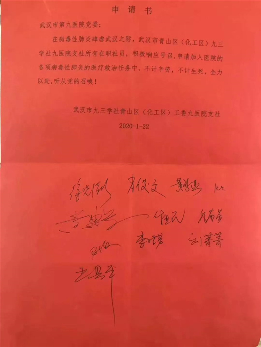 九三學社武漢市青山區(qū)(化工區(qū))工委九醫(yī)院支社集體向醫(yī)院提交申請書,申請加入醫(yī)院的各項病毒性肺炎的醫(yī)療救治任務中,不計辛苦,不計生死,全力以赴,聽從黨的召喚。