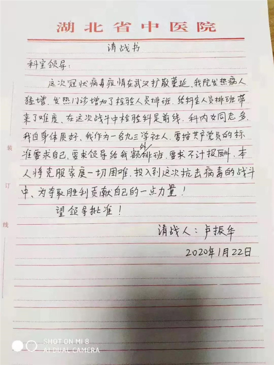 社湖北省中醫(yī)院支社盧振華醫(yī)生遞交請戰(zhàn)書