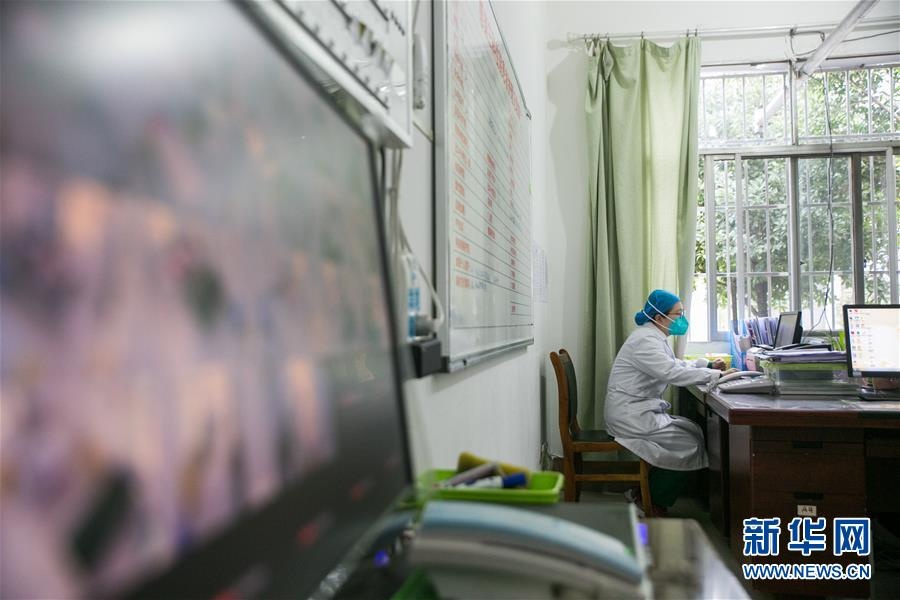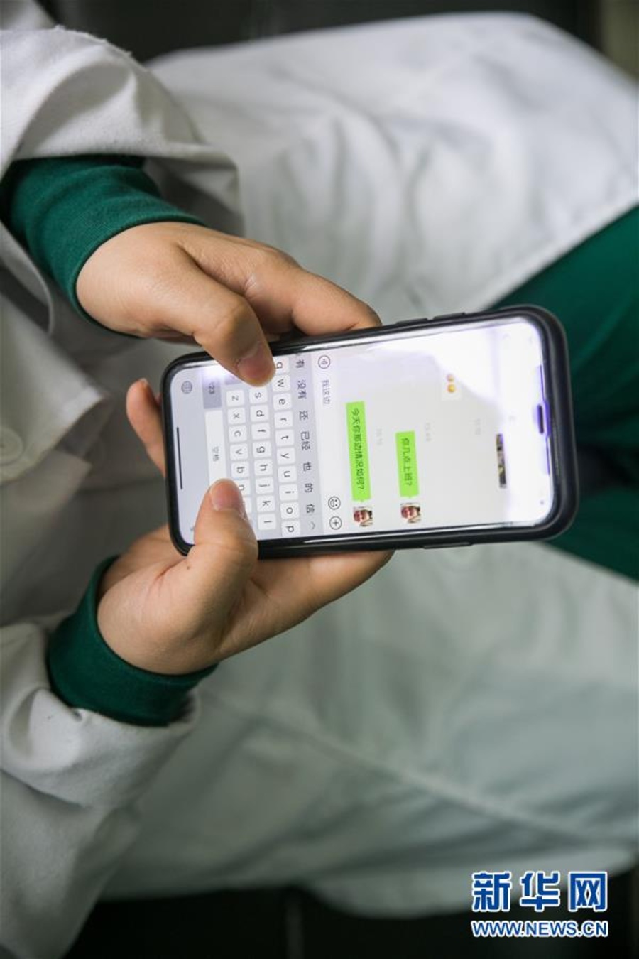 1月27日,在貴州省畢節(jié)市第三人民醫(yī)院感染科,黃迪在休息間隙給工作在廣州市第一人民醫(yī)院隔離病房一線的丈夫何志翔手機(jī)留言,了解對(duì)方工作情況