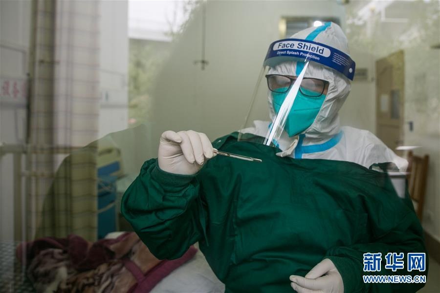 1月27日,在貴州省畢節(jié)市第三人民醫(yī)院感染科,黃迪在查看隔離病人的體溫