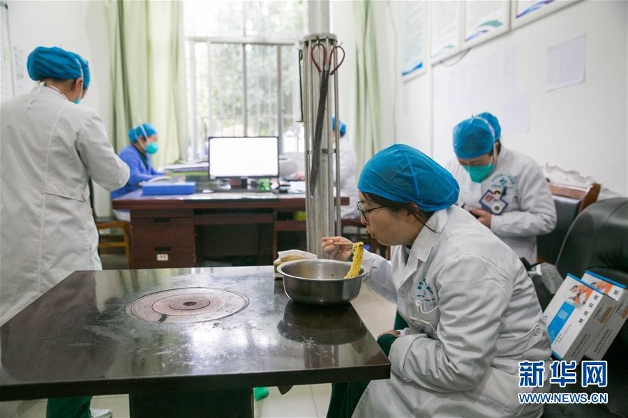 1月27日,在貴州省畢節(jié)市第三人民醫(yī)院感染科,黃迪(前)在辦公室吃午餐
