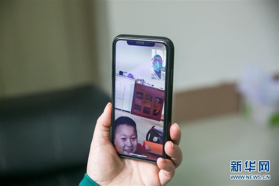 1月27日,在貴州省畢節(jié)市第三人民醫(yī)院感染科,黃迪在休息間隙和廣東的孩子視頻通話