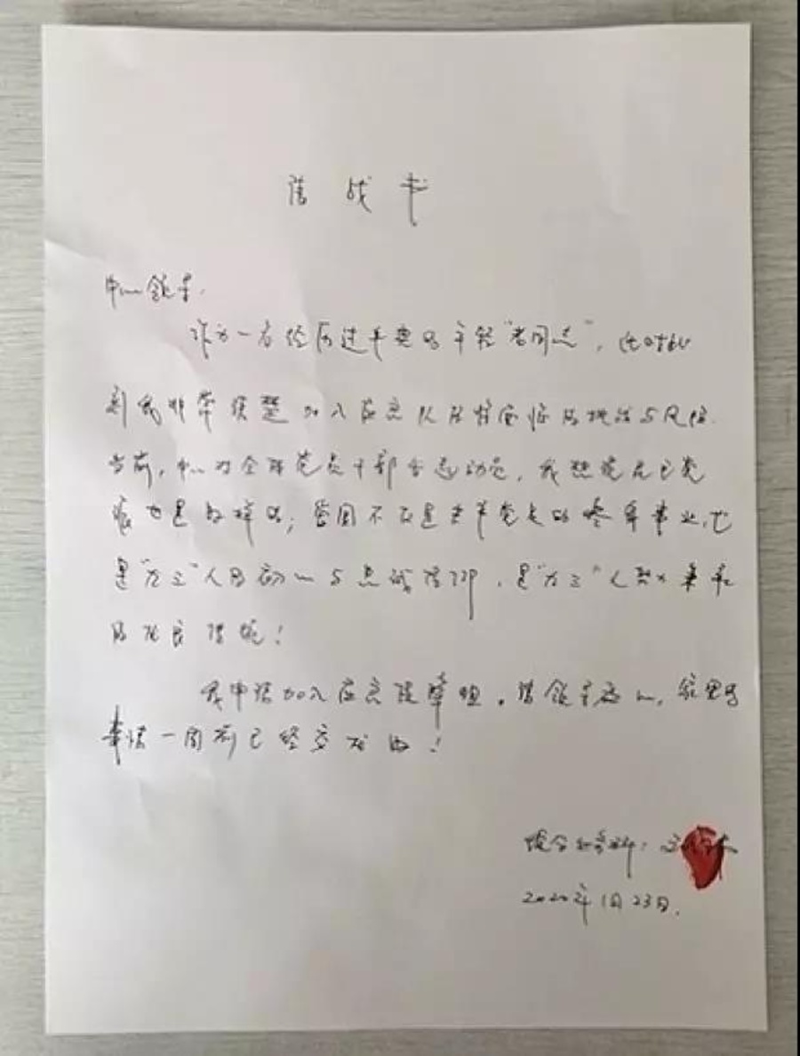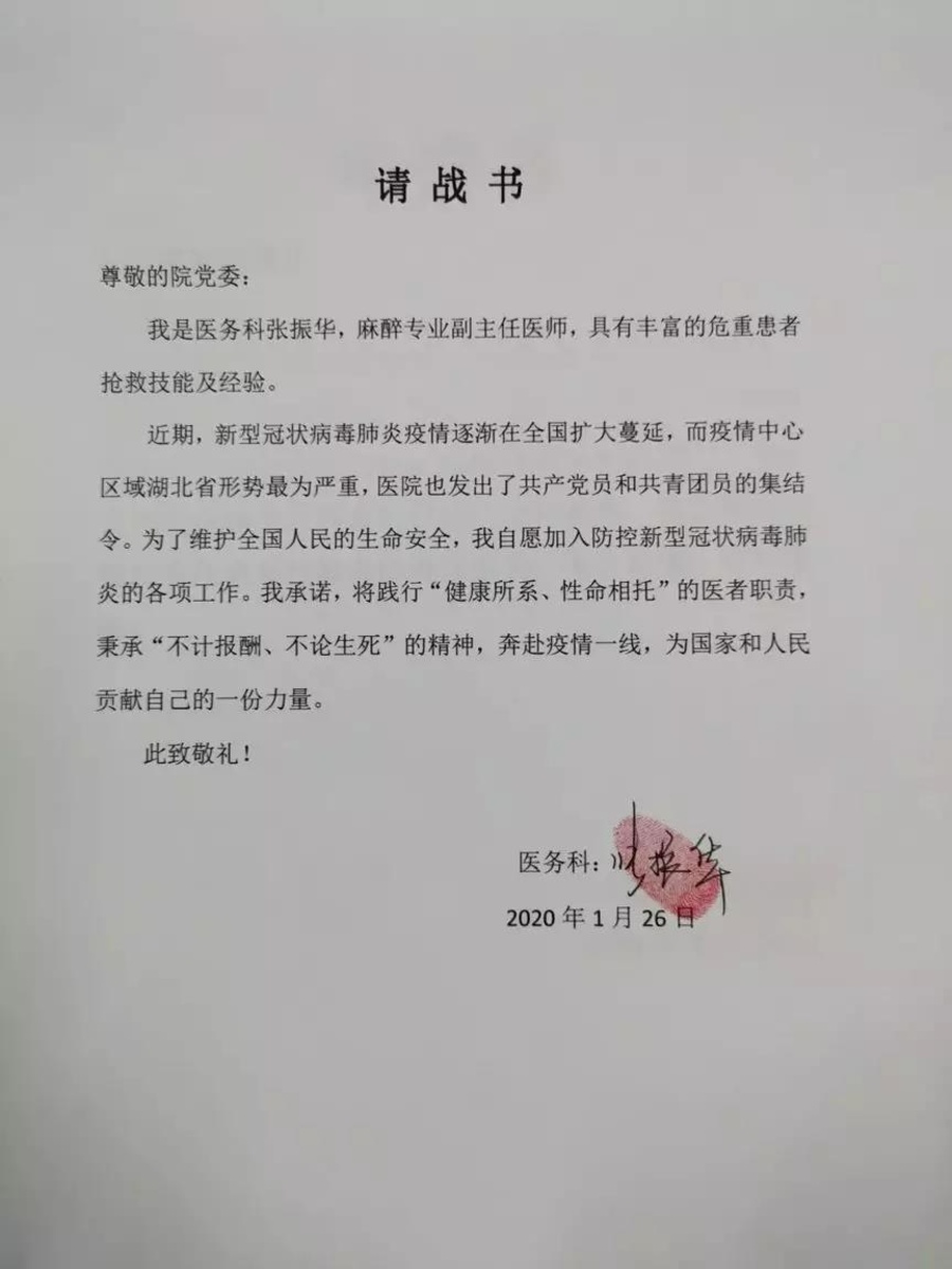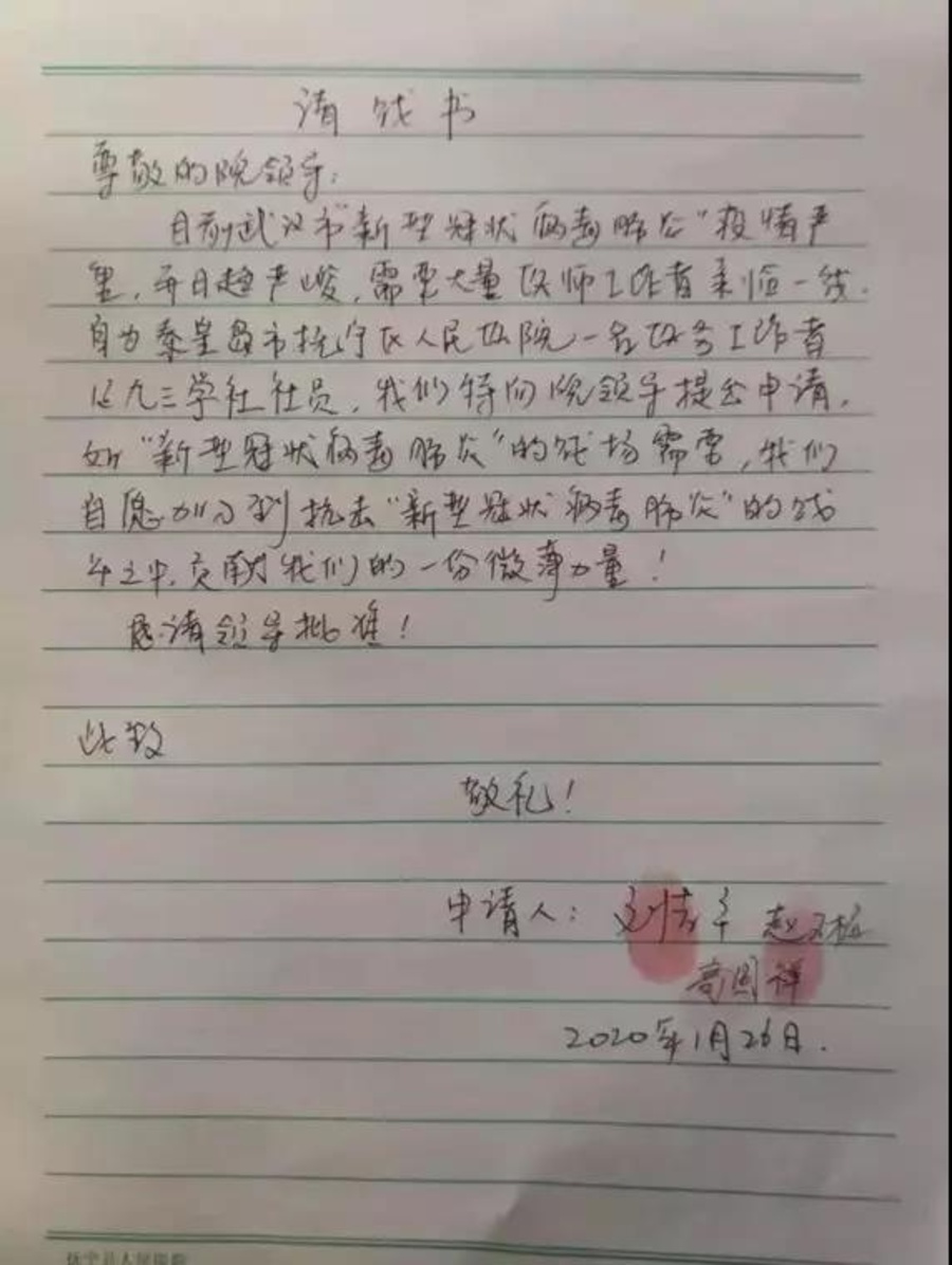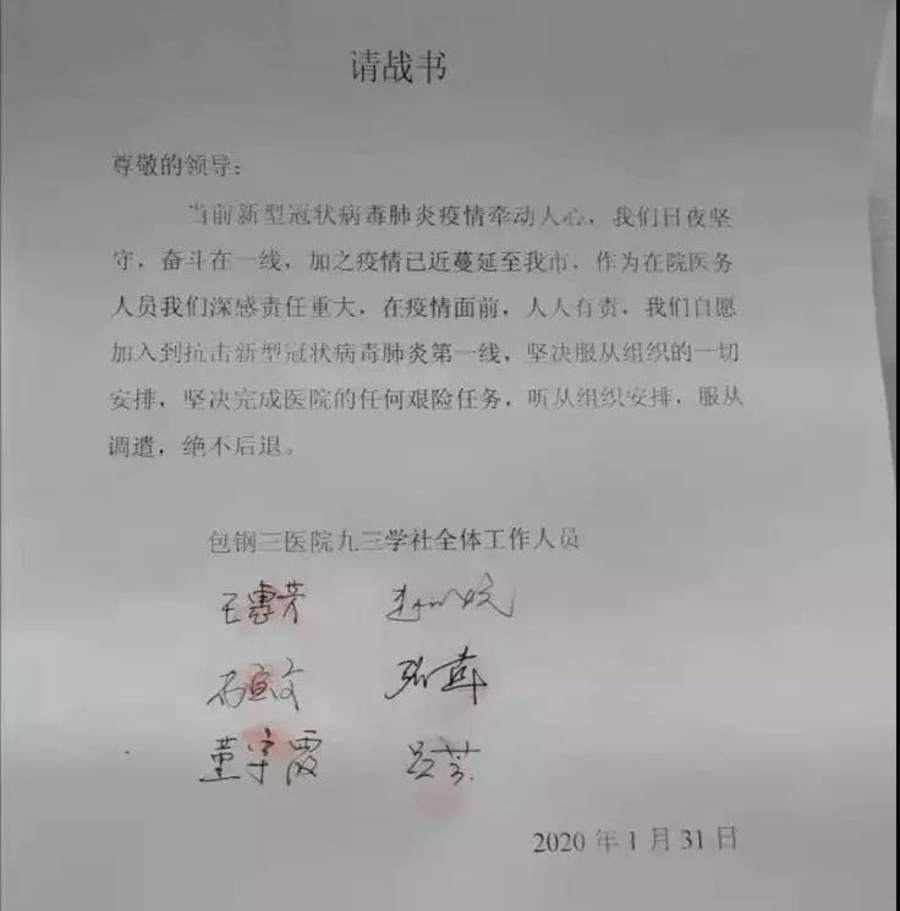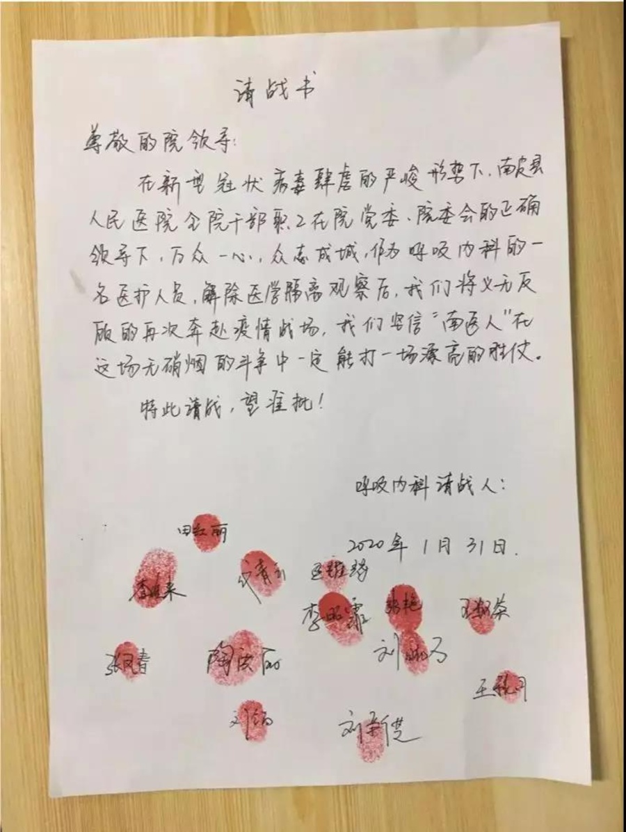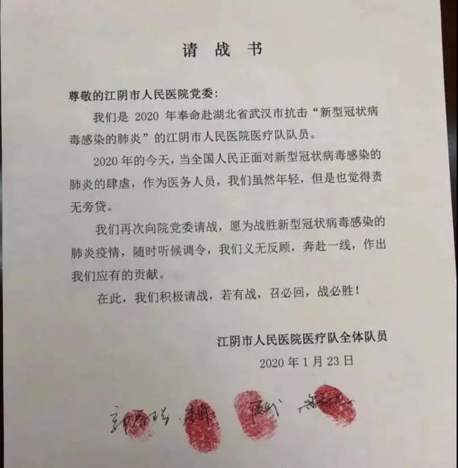“如戰(zhàn)場需要,我們自愿加入到抗擊新型冠狀病毒肺炎的戰(zhàn)斗之中,貢獻(xiàn)我們一份微薄力量!”