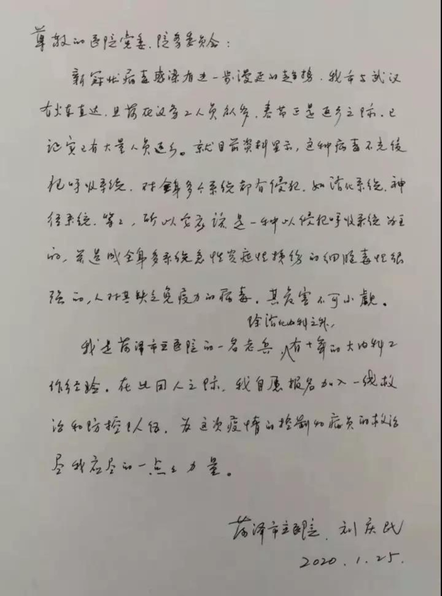 “我是一名老兵,除消化內(nèi)科之外,有十年的大內(nèi)科工作經(jīng)驗(yàn)。在此用人之際,我自愿報(bào)名加入一線救治和防控隊(duì)伍,為這次疫情的控制和病員的救治盡我應(yīng)盡的一點(diǎn)點(diǎn)力量。”