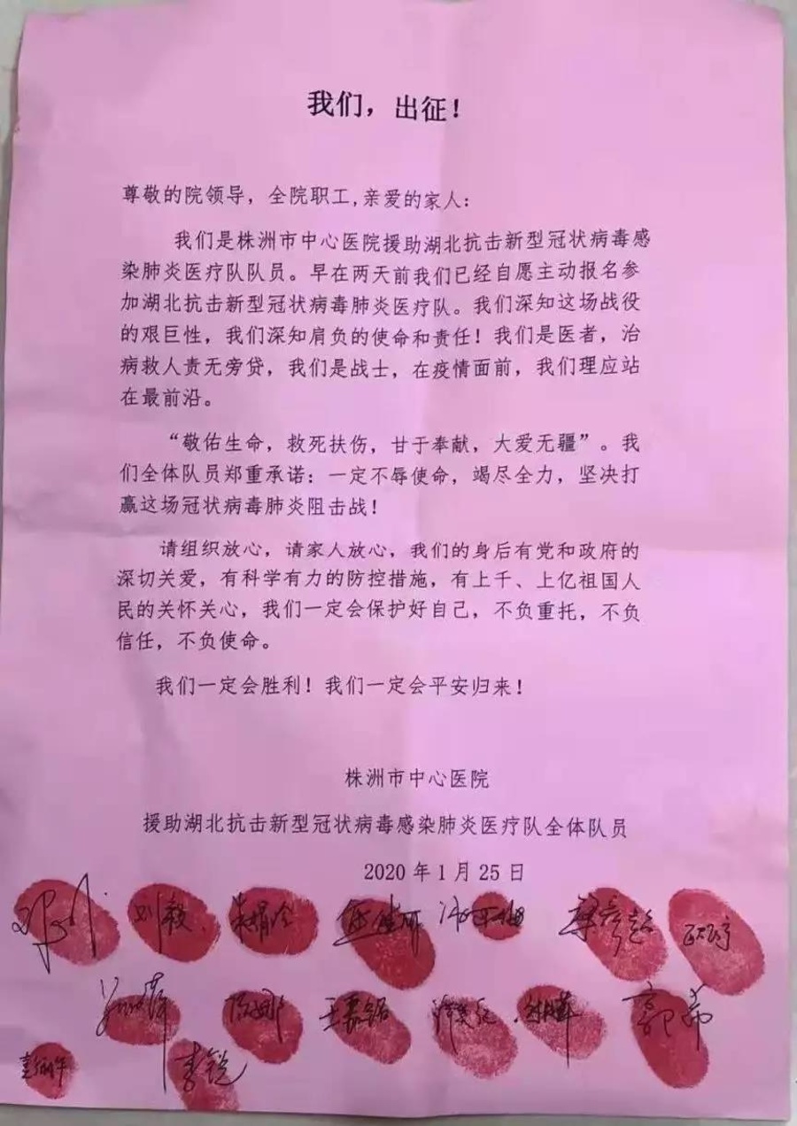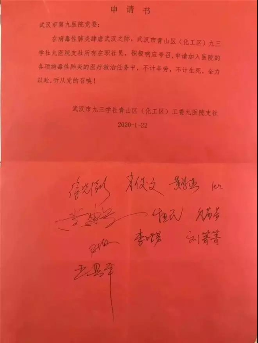 “在病毒性肺炎肆虐武漢之際,我們積極響應(yīng)號召,申請加入醫(yī)院的各項(xiàng)病毒性肺炎的醫(yī)療救治任務(wù)中,不計(jì)辛勞,不計(jì)生死,全力以赴,聽從黨的召喚!”
