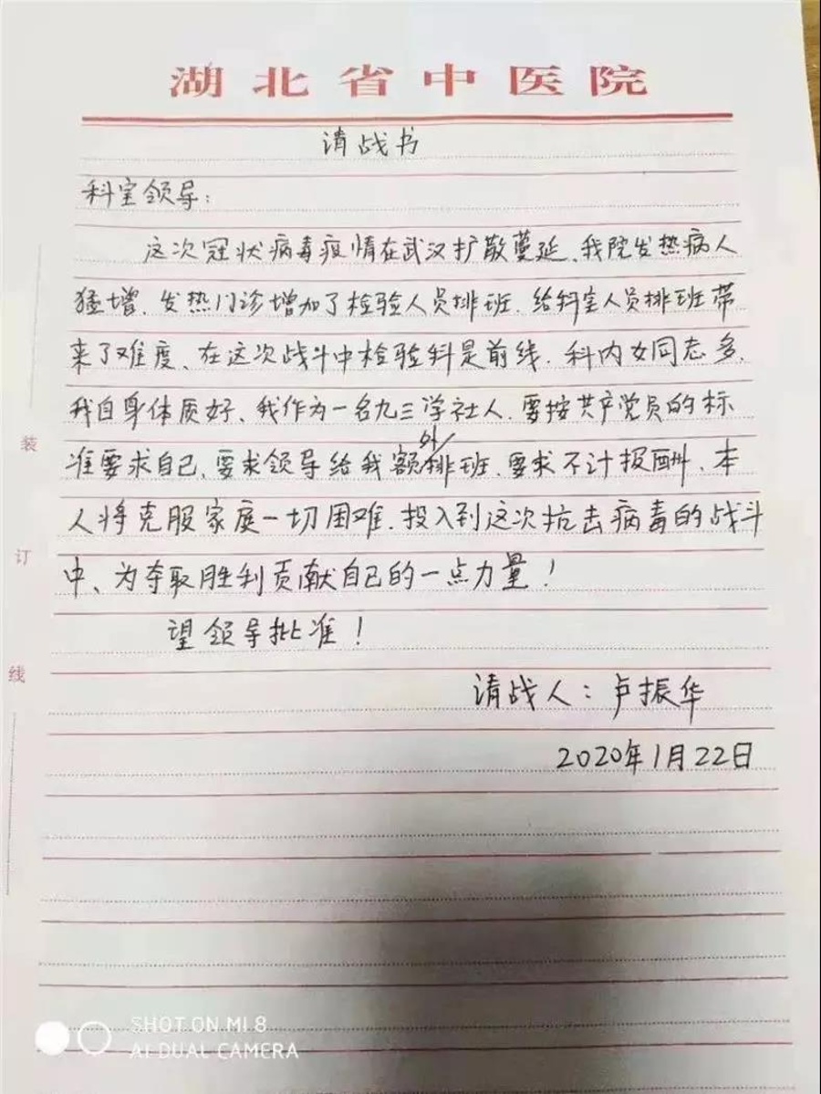 “科內(nèi)女同志多,我自身體質(zhì)好,作為九三學(xué)社人,要按共產(chǎn)黨員的標(biāo)準(zhǔn)要求自己,要求領(lǐng)導(dǎo)給我額外排班,不計(jì)報(bào)酬,將克服家庭一切困難,投身到這次抗擊病毒的戰(zhàn)斗中。”