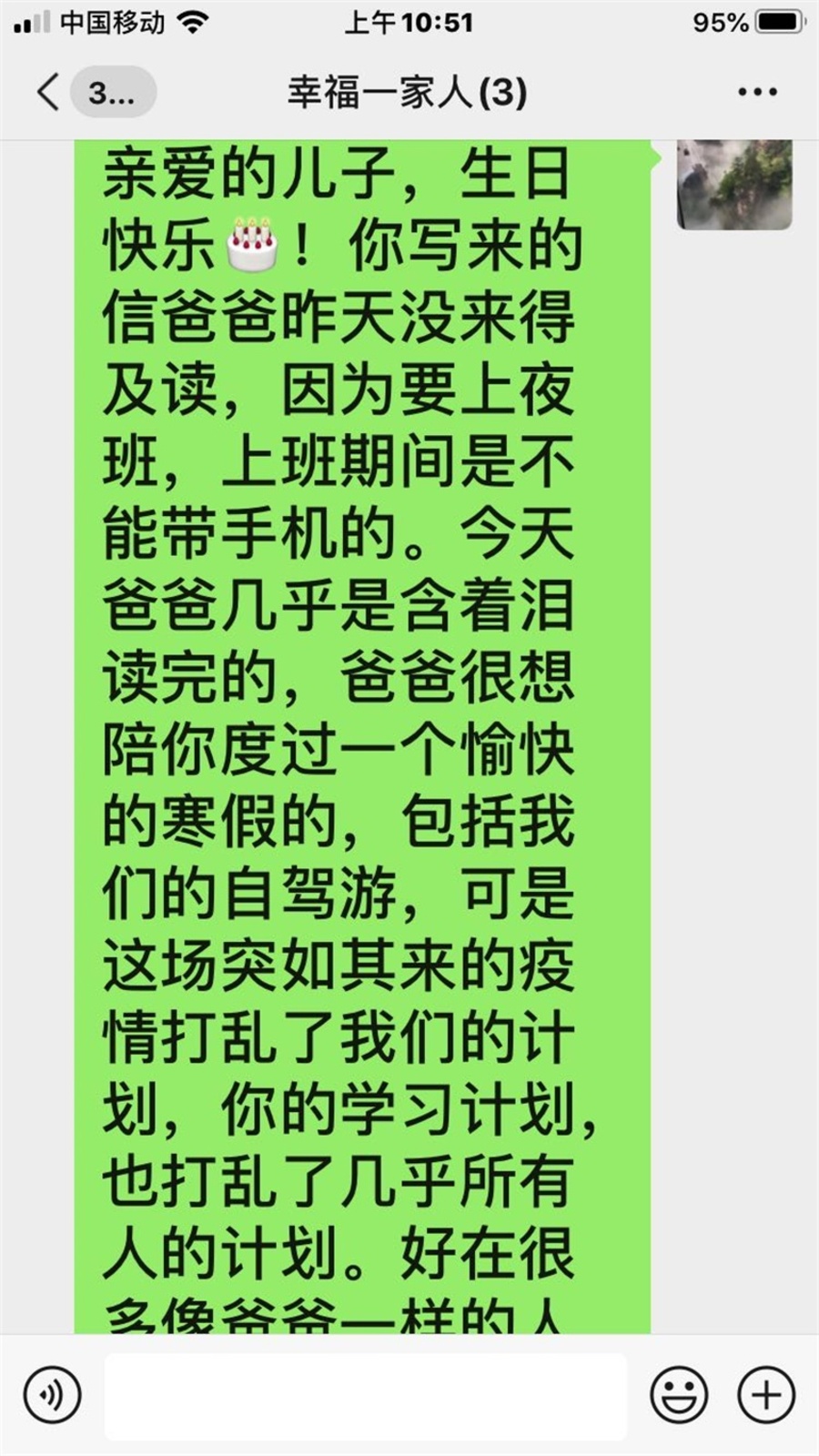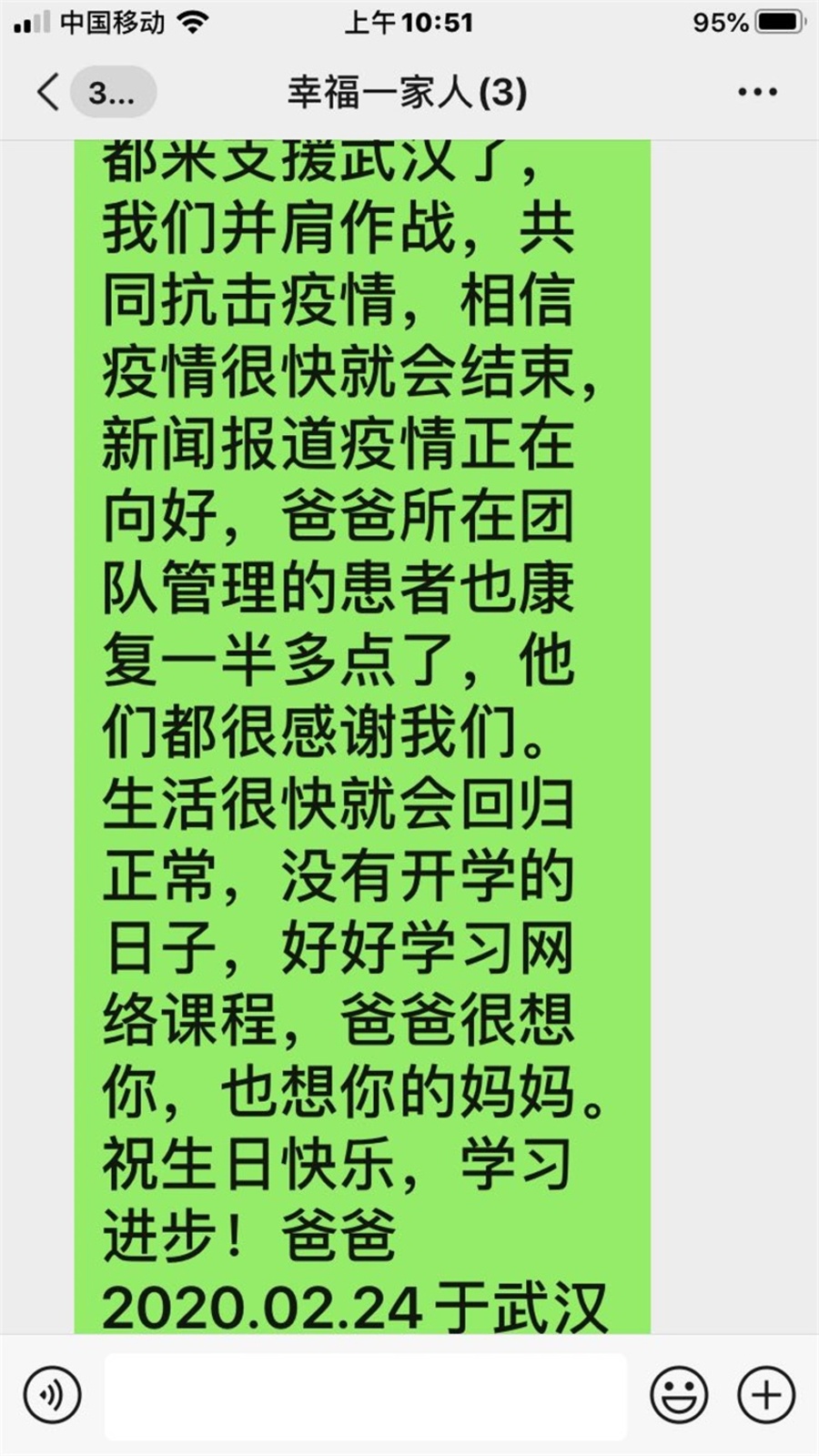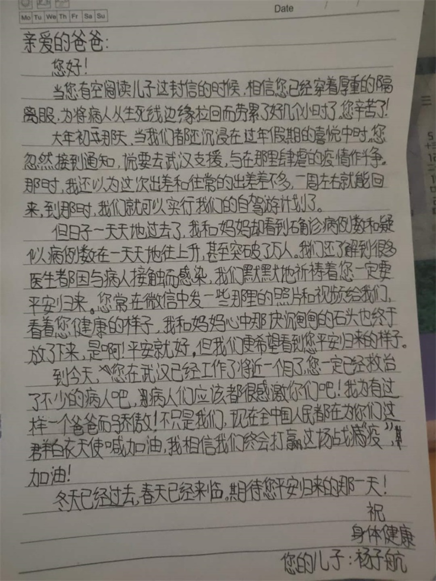 生日快樂(lè)!你寫(xiě)來(lái)的信爸爸昨天沒(méi)來(lái)得及讀,因?yàn)橐弦拱啵习嗥陂g是不能帶手機(jī)的。今天爸爸幾乎是含著淚讀完的,爸爸很想陪你度過(guò)一個(gè)愉快的寒假的,包括我們的自駕游,可是這場(chǎng)突如其來(lái)的疫情打亂了我們的計(jì)劃,你的學(xué)習(xí)計(jì)劃,也打亂了幾乎所有人的計(jì)劃。好在很多像爸爸一樣的人都來(lái)支援武漢了,我們并肩作戰(zhàn),共同抗擊疫情,相信疫情很快就會(huì)結(jié)束,新聞報(bào)道疫情正在向好,爸爸所在團(tuán)隊(duì)管理的患者也康復(fù)了一半多點(diǎn)了,他們都很感謝我們。