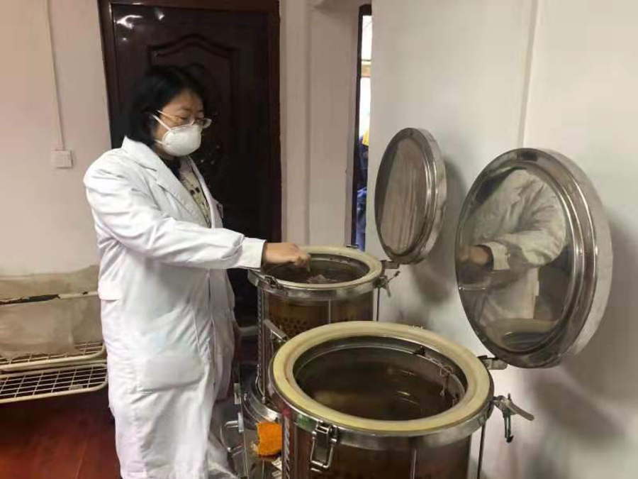 伍莉為一線醫(yī)務(wù)人員熬制中藥
