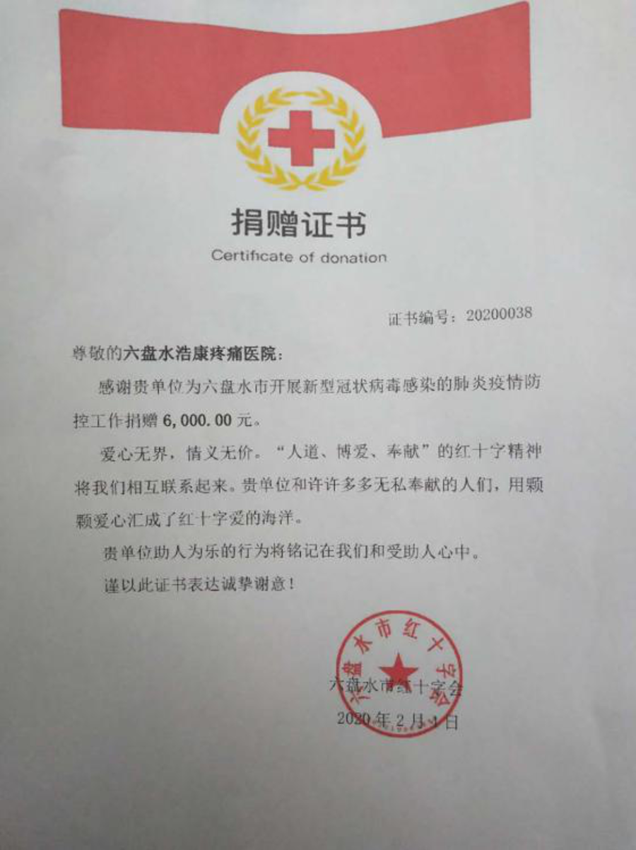 六盤水浩康疼痛醫(yī)院向市、區(qū)紅十字捐款