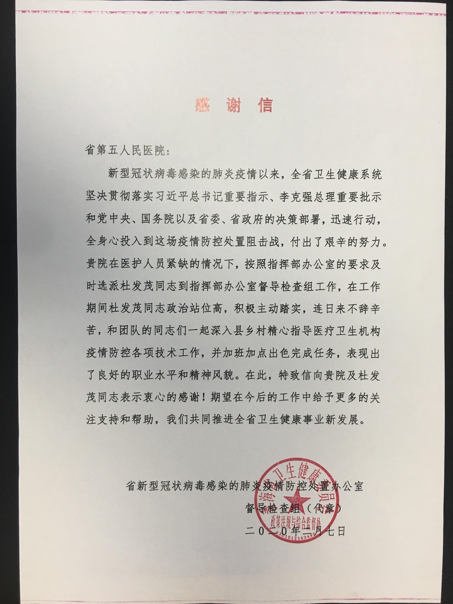 督查組發(fā)感謝信向省第五人民醫(yī)院及杜發(fā)茂本人表示感謝。