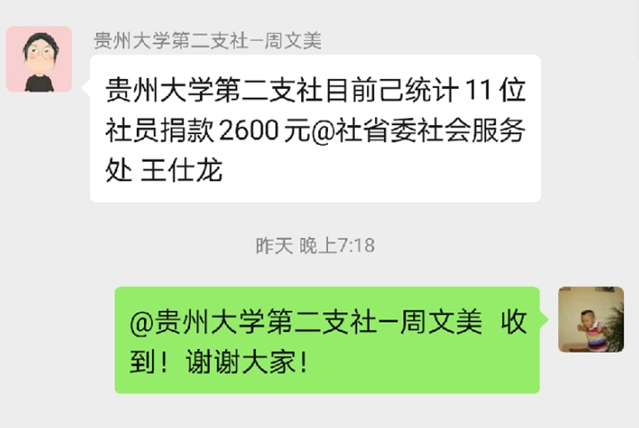 在“九三黔行”微信群里,自愿捐款的倡議一經(jīng)發(fā)布就得到積極響應(yīng),短時間內(nèi),微信群信息快速刷屏。黃宗洪主委等領(lǐng)導(dǎo)帶頭捐款,各級社組織負(fù)責(zé)人和部分社員紛紛來電,有的了解捐款操作程序,有的報送捐款數(shù)據(jù),大家表示要在社組織的帶領(lǐng)下,協(xié)助省委省政府團(tuán)結(jié)一心、共克時艱,為戰(zhàn)勝疫情貢獻(xiàn)一份自己的力量。