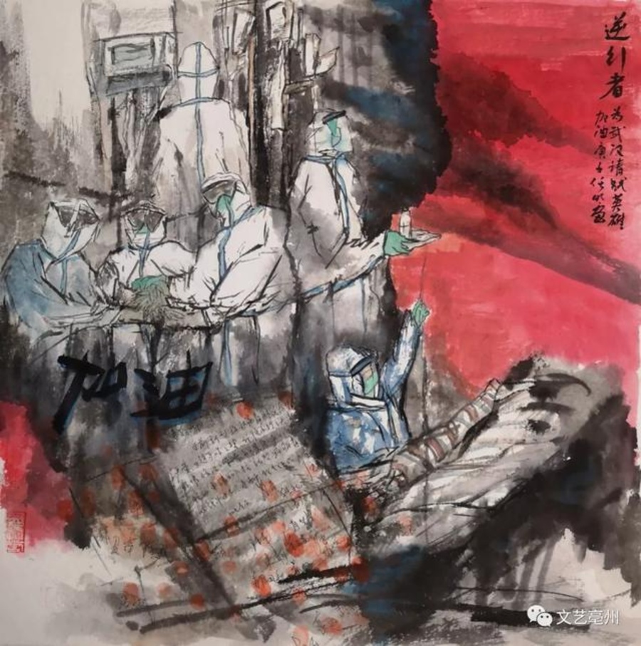 亳州書畫界社員紛紛加入戰(zhàn)“疫”隊伍。亳州市美協(xié)主席任明、譙城區(qū)美協(xié)主席李景國等積極響應(yīng)號召,組織亳州市書畫家創(chuàng)作六十余幅書畫作品,用手中的筆作“槍”,努力用作品凝聚力量、鼓舞士氣。《逆行者》《眾志成城》《出征》等一幅幅大氣磅礴的作品生動再現(xiàn)疫情之下社會各界團結(jié)一心、共克時艱的感人畫面。