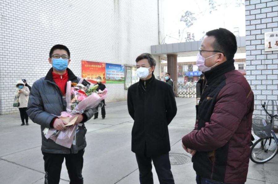 3月12日,是廊坊市新冠肺炎定點(diǎn)收治醫(yī)院全體醫(yī)務(wù)人員解除集中醫(yī)學(xué)隔離、健康歸隊(duì)的日子。九三學(xué)社廊坊市委主委王學(xué)求、專(zhuān)職副主委李志芳專(zhuān)程前往廊坊賓館看望慰問(wèn)參與新冠肺炎一線(xiàn)戰(zhàn)斗的安冠旭、牛文輝、員金利三位社員,代表社市委對(duì)他們舍小家、為大家、勇于擔(dān)當(dāng)、沖鋒一線(xiàn)的奉獻(xiàn)精神表示誠(chéng)摯的感謝,對(duì)他們表示親切的問(wèn)候,歡迎他們平安凱旋歸來(lái)!!