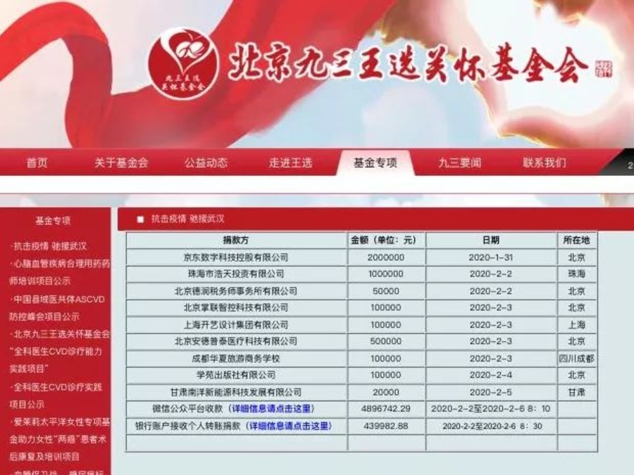 1月25日大年初一,九三學(xué)社中央領(lǐng)導(dǎo)指示王選關(guān)懷基金會(huì)盡快設(shè)立專(zhuān)項(xiàng)基金,通過(guò)社湖北省委協(xié)調(diào),支援湖北省疫情一線(xiàn)防控。在九三學(xué)社中央促創(chuàng)工委副主任、京東數(shù)字科技控股有限公司副總裁傅彤的多方聯(lián)系下,京東數(shù)字科技控股有限公司決定首期向九三王選關(guān)懷基金會(huì)捐資200萬(wàn)元,與九三學(xué)社中央和九三王選關(guān)懷基金會(huì)共同發(fā)起成立抗擊新型冠狀病毒肺炎專(zhuān)項(xiàng)基金。該捐款平臺(tái)自2月2日上線(xiàn)以來(lái),得到各級(jí)社組織和廣大社員的強(qiáng)烈支持。截至2月6日,平臺(tái)已收到捐款930多萬(wàn)元。目前,基金會(huì)正積極采購(gòu)防疫緊缺醫(yī)療物資,與社湖北省地方組織溝通捐贈(zèng)事宜。