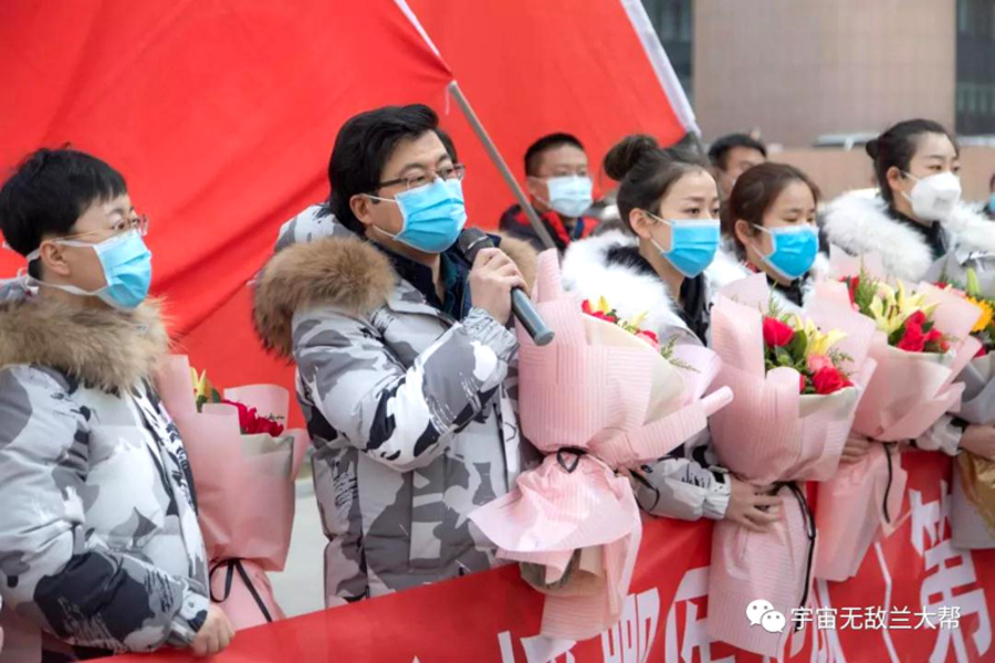 2月17日14時,莊嚴(yán)的出征儀式在蘭大二院至公堂前舉行。蘭州大學(xué)、蘭大二院領(lǐng)導(dǎo)以及100余多位干部職工和醫(yī)護(hù)人員自發(fā)前來為他們壯行。