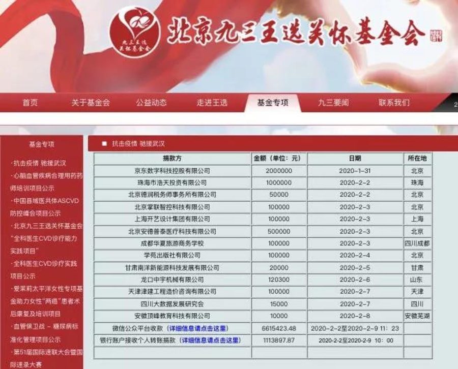 自湖北武漢發(fā)生新冠肺炎疫情以來,很多九三學(xué)社社員及愛心企業(yè)詢問捐款事宜,希望為疫情防控一線獻(xiàn)愛心、做貢獻(xiàn)。1月25日大年初一,九三學(xué)社中央領(lǐng)導(dǎo)同志部署九三王選關(guān)懷基金會,成立專項(xiàng)基金,發(fā)動全社及社會各界力量,支援一線抗疫。在社中央領(lǐng)導(dǎo)下,2月2日,九三王選關(guān)懷基金會聯(lián)合京東數(shù)字科技控股有限公司共同發(fā)起成立的九三王選關(guān)懷基金會抗擊新冠肺炎專項(xiàng)基金正式上線。