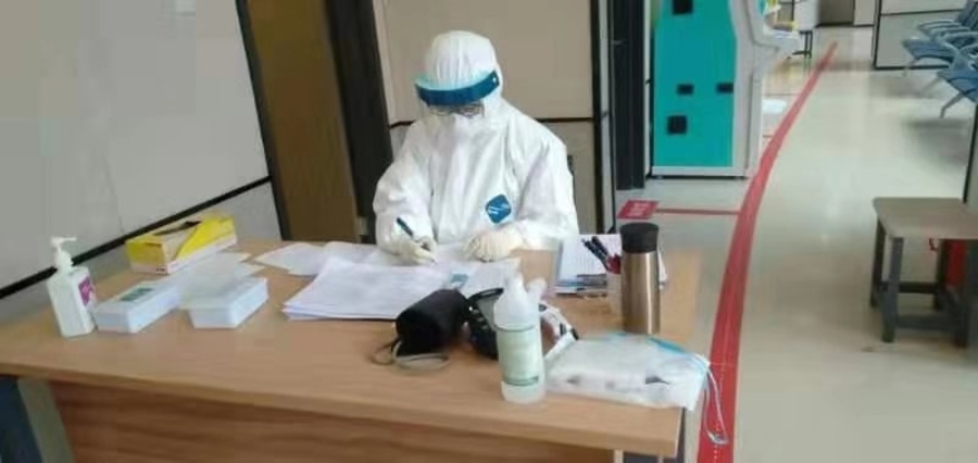 社員、南京市中醫(yī)院張彥亮堅守發(fā)熱門診崗位,接診處置患者,采集咽拭子標(biāo)本進(jìn)行進(jìn)一步確診。