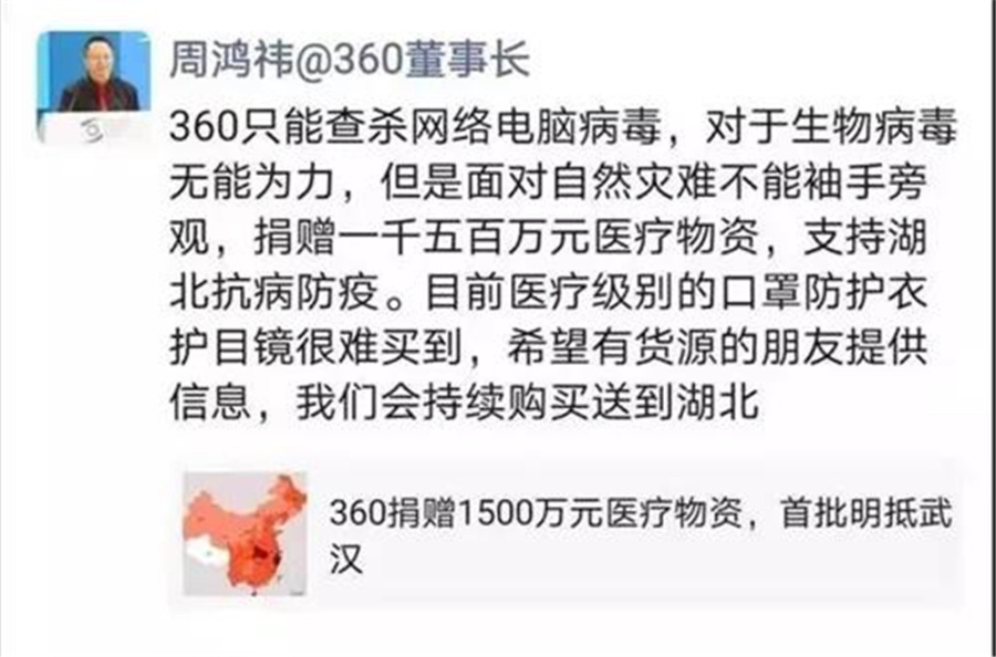 〖周鴻祎:360公司捐贈(zèng)1500萬醫(yī)療物資〗