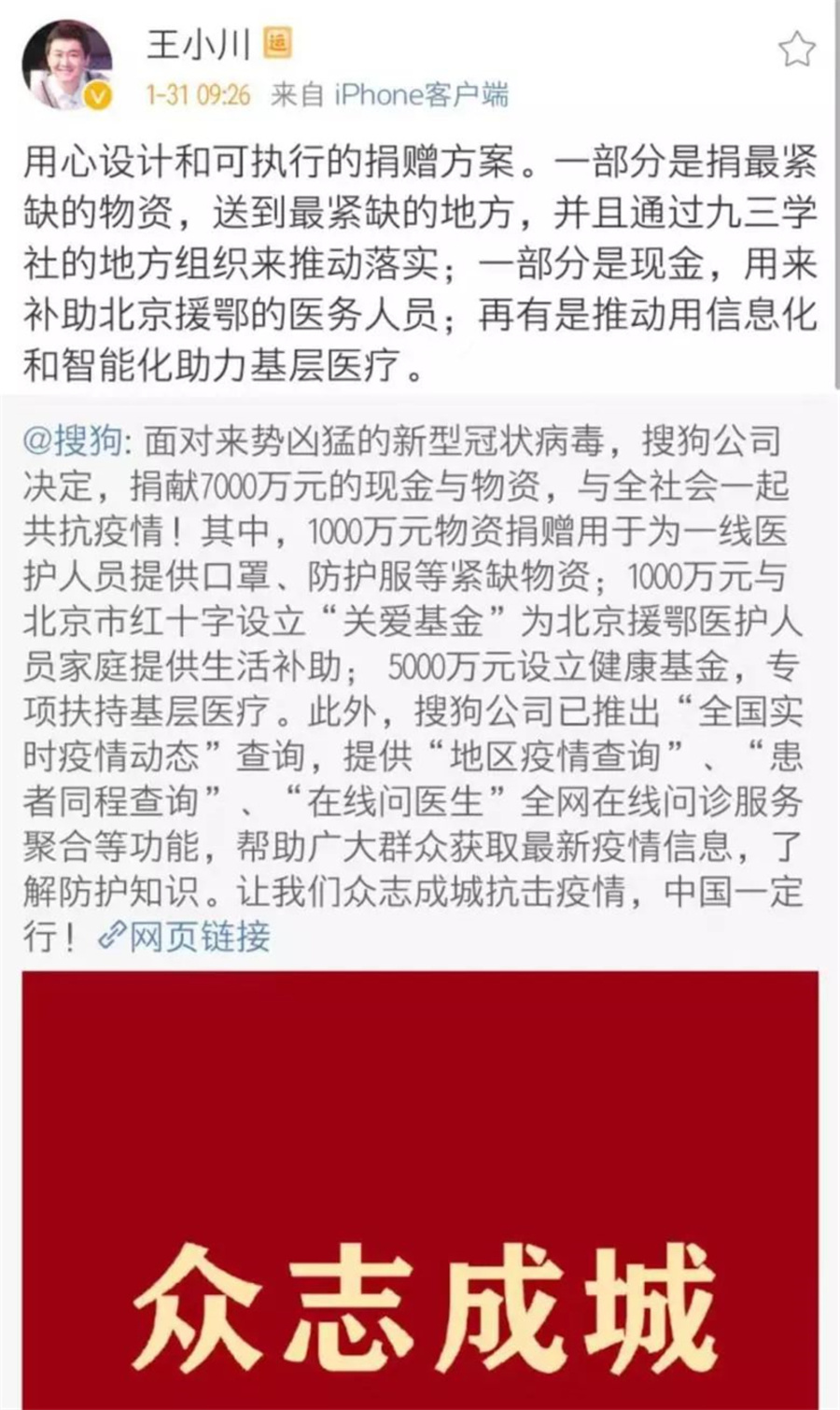 〖王小川:搜狗公司捐贈(zèng)7000萬現(xiàn)金及物資〗