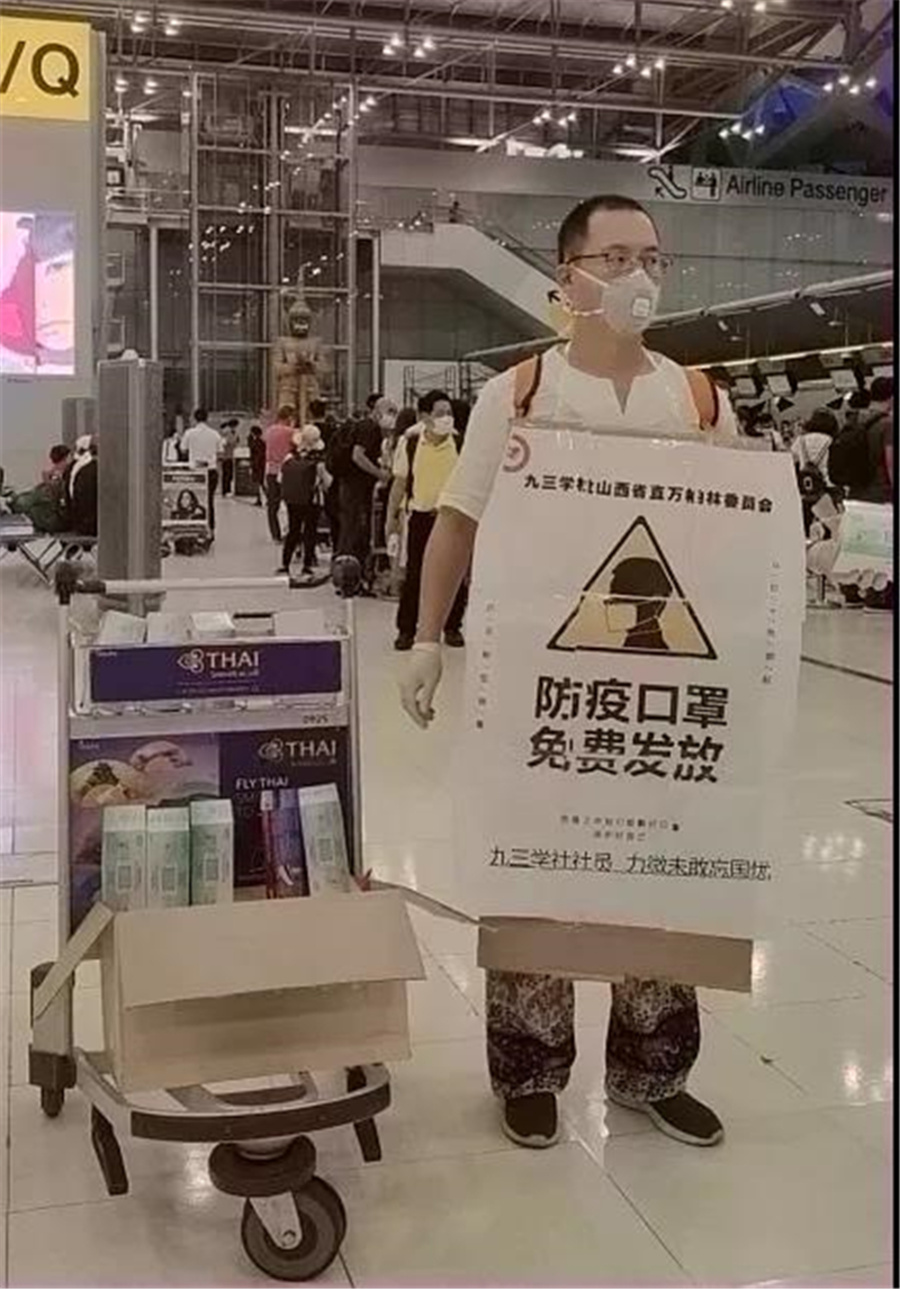 在國外的中國游客人生地不熟,如何購買防疫口罩成為大多數(shù)人面臨的一個(gè)難題。與社組織商定后,梁芮銘決定:不隨團(tuán)回國,一個(gè)人留下來,以九三學(xué)社山西省直萬柏林區(qū)委員會(huì)的名義,在泰國素萬那普國際機(jī)場向所有回國的中國公民免費(fèi)發(fā)放防疫口罩,發(fā)放時(shí)間從1月27日到2月3日,所需經(jīng)費(fèi)由九三學(xué)社山西省直萬柏林區(qū)委員會(huì)社員捐款籌集。