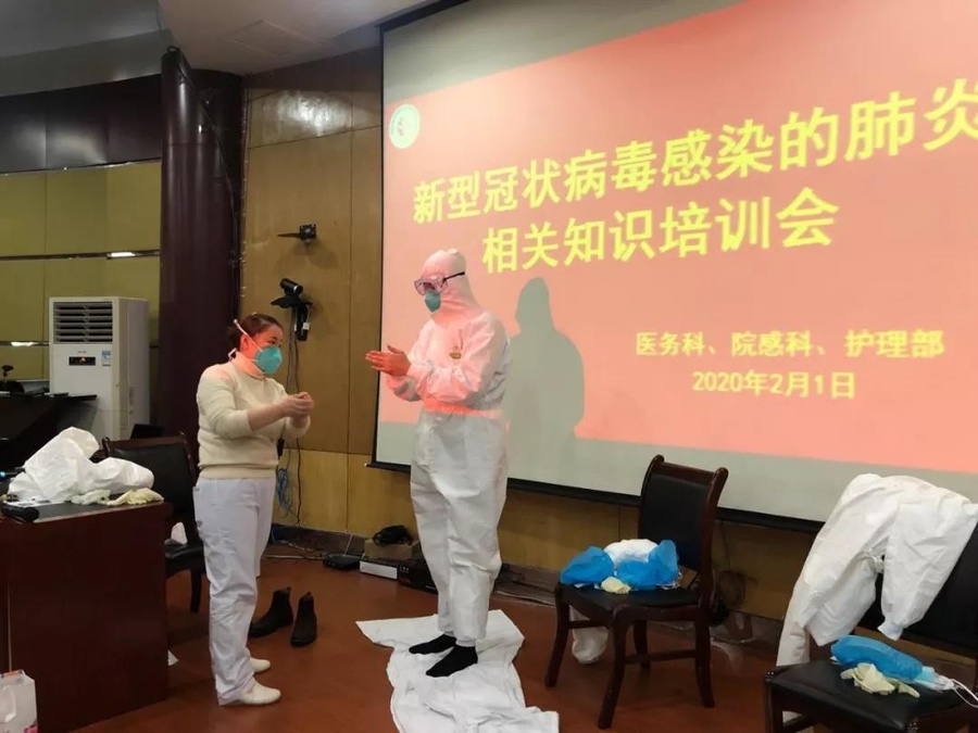 社員唐玲現(xiàn)場指導穿脫隔離服