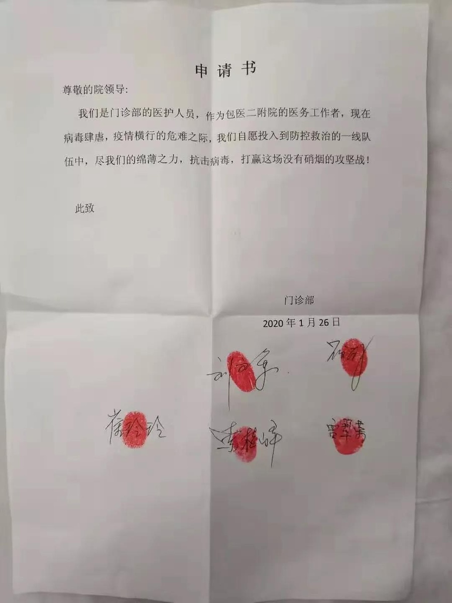 包鋼三醫(yī)院的呂芳、石寶文、王惠芳、張萍、趙曉亮、董宇霞6位社員以集體名義向院領(lǐng)導(dǎo)遞交請(qǐng)戰(zhàn)書(shū),寫(xiě)道:“我們自愿加入到抗擊新型冠狀病毒肺炎第一線,堅(jiān)決服從組織的一切安排,堅(jiān)決完成醫(yī)院的任何艱險(xiǎn)任務(wù),聽(tīng)從組織安排,服從調(diào)遣,絕不后退”。6位社員中既有十幾年社齡的社基層組織負(fù)責(zé)人,也有2019年新入社的社員,他們一起擔(dān)負(fù)起黨和人民賦予的重任,守護(hù)人民群眾生命安全和身體健康。