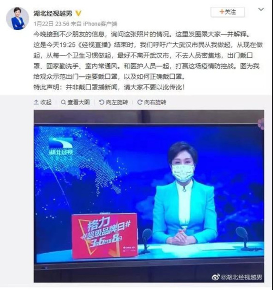 其他行業(yè)的九三社員紛紛行動起來,1月22日,湖北經(jīng)視《經(jīng)視直播》節(jié)目中,社省委委員、湖北廣播電視臺電視經(jīng)濟(jì)頻道高級主播高越男在當(dāng)天節(jié)目的最后,特地戴上口罩做示范,呼吁大家外出做好防護(hù)。今天,微博話題#湖北主持人戴口罩播報#也登上了熱搜榜第一名!戴起口罩!眾志成城,我們一定能夠打贏這場疫情防控戰(zhàn),希望每一位朋友平平安安、健健康康!