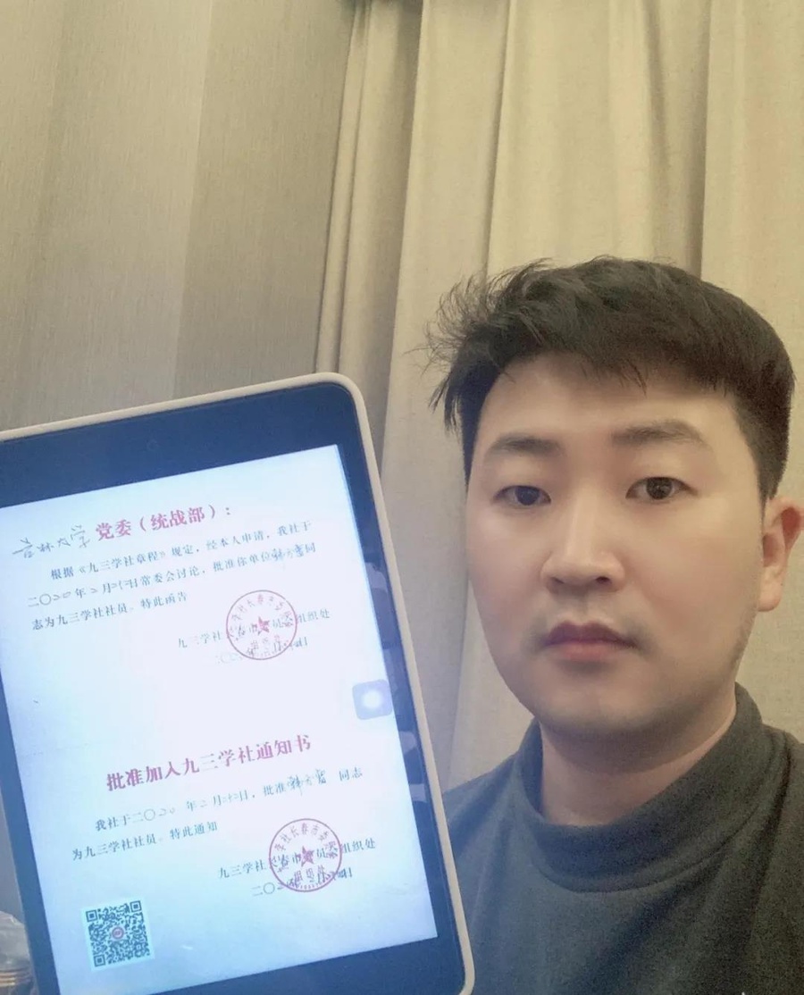 2月21日,社市委專職副主委李銘向張紅星主委匯報(bào)了我的情況后,張紅星主委表示:韓方雷同志面對(duì)疫情毫不退縮,勇于擔(dān)當(dāng),甘于奉獻(xiàn),是符合我們九三學(xué)社標(biāo)準(zhǔn)的好同志,對(duì)于他的愿望我們應(yīng)該“特事特辦”,予以支持。經(jīng)過兩天時(shí)間,通過與社市委各位常委的溝通,并請(qǐng)示九三學(xué)社吉林省委員會(huì)、中共長春市委統(tǒng)戰(zhàn)部后,2月24日我光榮地成為了九三學(xué)社社員!