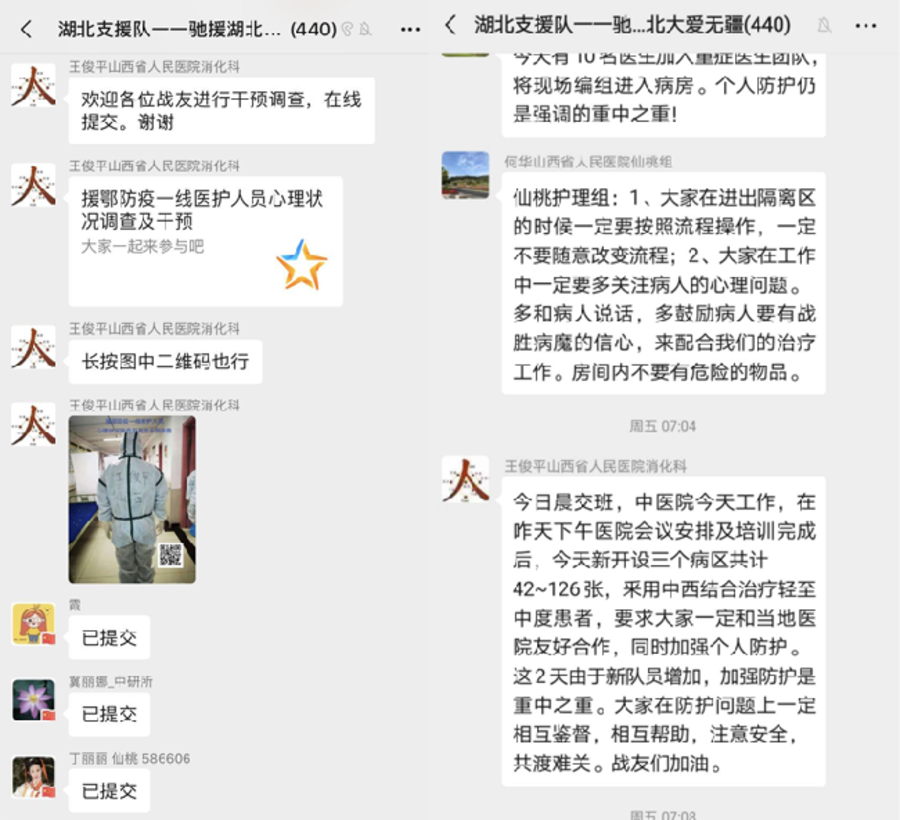 拼版圖片:左圖王俊平在山西支援湖北醫(yī)療隊微信群內(nèi)征集調(diào)查問卷。右圖為王俊平在微信群中提醒醫(yī)務人員注意防護。新華網(wǎng) 發(fā)