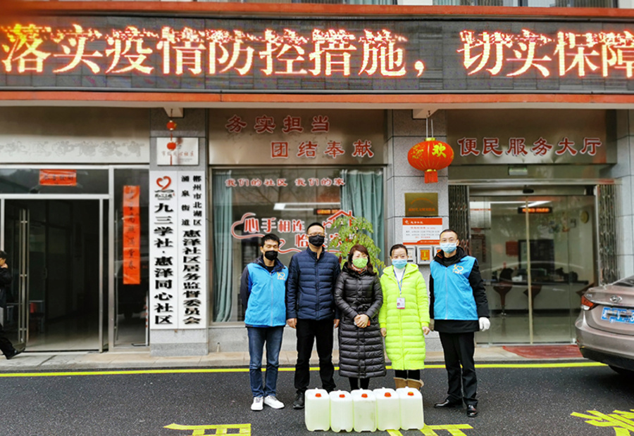基層社區(qū)處于疫情防控“戰(zhàn)場(chǎng)”的最前沿,也是疫情防控的重點(diǎn)和難點(diǎn),社區(qū)工作人員為疫情防控付出了巨大努力,但是物資短缺給他們工作增添了困擾。疫情就是命令,劉艷紅立即聯(lián)系九三社員、市慈善總會(huì)副會(huì)長(zhǎng)鄧德武,詢(xún)問(wèn)之前聯(lián)系的消毒液什么時(shí)候能到貨,鄧德武即刻催促物流,終于在下午五點(diǎn)多把1000斤消毒液送到九三學(xué)社郴州市委,劉艷紅一刻也不敢耽擱,立即帶領(lǐng)志愿者將消毒液送到了北湖區(qū)下湄橋花園洞社區(qū)、涌泉街道惠澤社區(qū)、保和中心學(xué)校、大塘中心學(xué)校等地,為他們解了燃眉之急,并將籌措到的20多只口罩也交給了花園洞社區(qū)。
