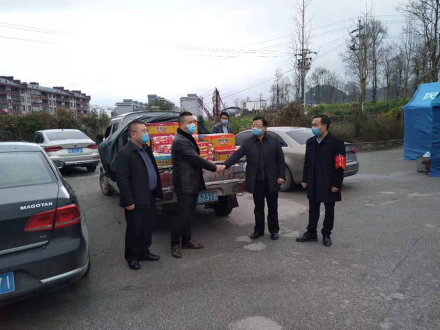 六枝永康骨傷科醫(yī)院院長(zhǎng)、社員劉俊(左二)捐贈(zèng)方便面、牛奶等價(jià)值8000元的慰問(wèn)物資給水黃路郎岱鎮(zhèn)卡點(diǎn)的疫情防控一線工作人員。