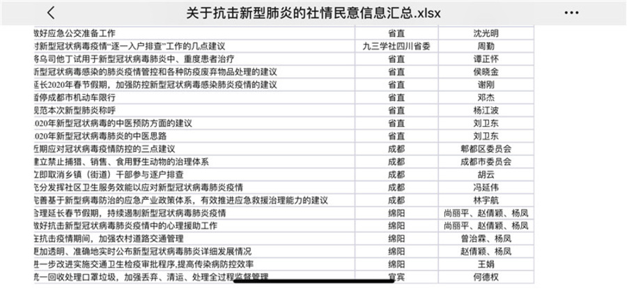 人民群眾是社會主義協(xié)商民主的重點,參政議政是民主黨派履行職能的第一要務(wù)。在突如其來的疫情面前,社省委積極動員廣大社員建言獻(xiàn)策,緊扣疫情防控工作,提交社情民意和意見建議21篇。其中社省直工委提交的《建議做好應(yīng)急公交準(zhǔn)備工作》《關(guān)于對“逐一入戶排查”工作的幾點建議》《建議規(guī)范本次新型肺炎稱呼》等,成都市委提交的《建議盡快確定新型冠狀病毒的官方英文名稱》《建議建立禁止捕獵、銷售、食用野生動物的治理體系》等,綿陽市委提交的《建議合理延長春節(jié)假期,持續(xù)遏制新型冠狀病毒肺炎疫情》《建議在抗擊疫情期間,加強(qiáng)農(nóng)村道路交通管理》等,宜賓市委提交的《建議統(tǒng)一回收處理口罩垃圾加強(qiáng)丟棄、清運、處理全過程監(jiān)督管理》共16篇信息已報送社中央、省政協(xié)及省委統(tǒng)戰(zhàn)部。各市、州基層組織也通過微信、網(wǎng)絡(luò)等方式積極做好建言獻(xiàn)策、釋疑解惑、輿論宣傳等工作。
