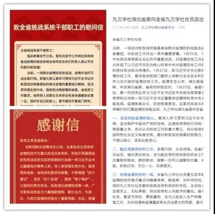 九三學(xué)社湖北省委會(huì)積極宣傳報(bào)道,號(hào)召全省社員積極行動(dòng)起來(lái),齊心協(xié)力抗擊新冠肺炎。1月23日,九三學(xué)社中央常務(wù)副主席邵鴻受武維華主席的委托,致電社湖北省委主委秦順全,聽(tīng)取情況匯報(bào),對(duì)武漢新型肺炎疫情表示深度關(guān)切,代表社中央慰問(wèn)湖北省九三學(xué)社社員,并對(duì)積極參與疫情防控提出要求和希望。1月23日至25日,九三學(xué)社湖北省委宣傳平臺(tái)分別轉(zhuǎn)發(fā)了社武漢市委青年工作委員會(huì)的《眾志成城 戰(zhàn)勝肺炎――致全體社員的一封倡議書》,《爾肯江·吐拉洪部長(zhǎng)致全省統(tǒng)戰(zhàn)系統(tǒng)干部職工的慰問(wèn)信》,《省委統(tǒng)戰(zhàn)部倡議書:眾志成城團(tuán)結(jié)一心 在疫情防控考驗(yàn)中貢獻(xiàn)統(tǒng)戰(zhàn)力量》等文章;1月28日,九三學(xué)湖北社省委發(fā)出《致全省九三學(xué)社社員的倡議書》,號(hào)召全省九三社員行動(dòng)起來(lái),共同抗擊新型肺炎,用社內(nèi)宣傳媒體凝聚起全省九三學(xué)社社員的思想共識(shí)。
