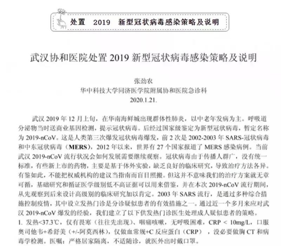 張勁農(nóng)主任針對(duì)新冠肺炎疫情撰寫專題文章在家隔離治療期間,張勁農(nóng)沒(méi)停止工作,他“隔空”閱片、討論病例、參與會(huì)診,還在家中起草了《武漢協(xié)和醫(yī)院上呼吸道感染及病毒樣肺炎初步診療方案》,為有效控制疫情提供了“協(xié)和方案”。隔離治療一周后,張勁農(nóng)逐漸恢復(fù)。他說(shuō):“康復(fù)后,我將繼續(xù)投入這場(chǎng)戰(zhàn)斗,與大家并肩作戰(zhàn)。”