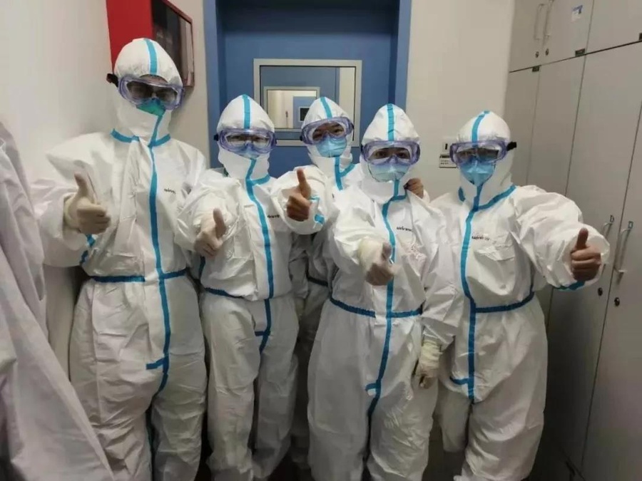 ▲馮俊教授與同事在武漢同濟(jì)醫(yī)院新冠肺炎住院部合影。