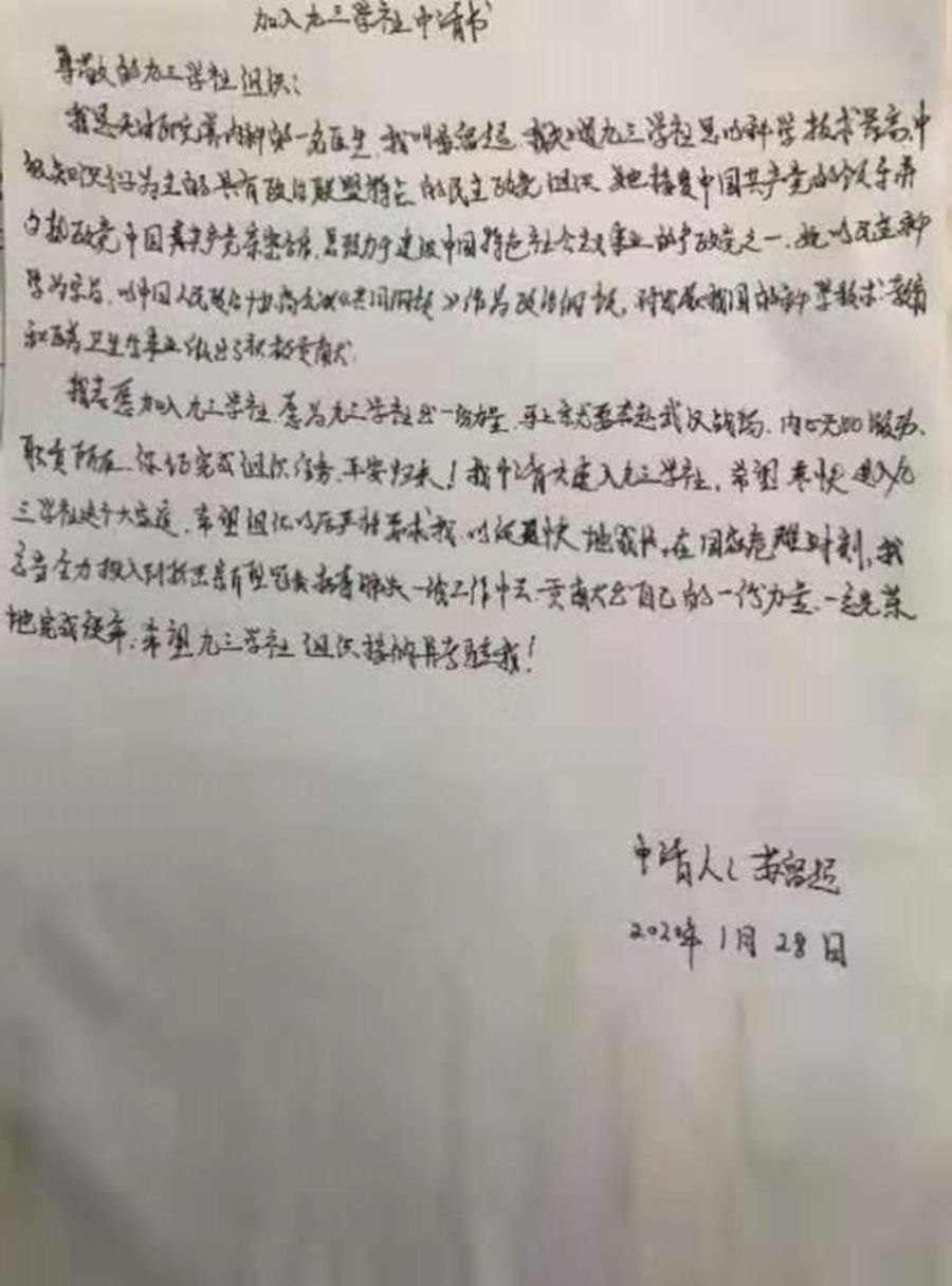 內科醫(yī)生蘇留超2019年5月申請加入九三學社,在考察期間,他積極參與社務工作,主動參加赴寶坻小白莊義診活動。疫情發(fā)生后,他主動請戰(zhàn),于2020年1月28日隨天津市第二批支援湖北醫(yī)療隊馳援武漢。出發(fā)前,他再一次寫下入社申請書,表達了志愿做九三人的決心。