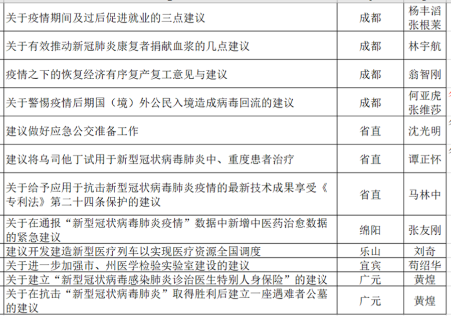 建言發(fā)聲起到了實(shí)實(shí)在在的效果。四川大學(xué)華西醫(yī)院耳鼻咽喉-頭頸外科主任醫(yī)師趙宇,電子科技大學(xué)外國語學(xué)院講師張維莎提交的《建議盡快確定新型冠狀病毒的官方英文名稱》推動了國家衛(wèi)健委對新冠病毒肺炎的“官方命名”;西華大學(xué)副教授劉俊和成都市郫都區(qū)人民法院立案庭庭長朱成均提出的《關(guān)于開設(shè)四省農(nóng)民工專列解決復(fù)工后東部企業(yè)用工難的建議》已在多地落地實(shí)施;成都社員李孟松律師、朱成均法官致函武漢市信訪局,指出當(dāng)?shù)厝松缇趾怂憷钗牧玲t(yī)生工亡賠償金誤使用了2018年的收入標(biāo)準(zhǔn),后經(jīng)媒體報(bào)道反饋,差額將隨后進(jìn)行賠付。