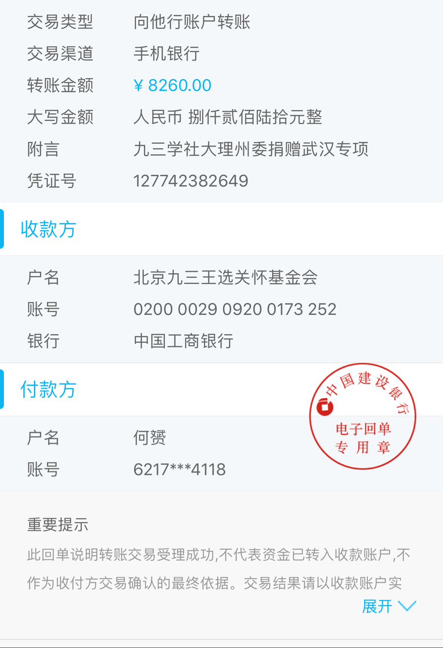 新型冠狀病毒肺炎疫情發(fā)生以來,九三學(xué)社大理州委高度重視,認(rèn)真貫徹落實(shí)中共中央、九三學(xué)社中央、中共云南省委省政府、九三學(xué)社云南省委、中共大理州委州政府的決策部署,全力做好防控工作。1月31日,社大理州委號(hào)召全州九三學(xué)社社員立即行動(dòng)起來,積極響應(yīng)各級(jí)黨委政府的號(hào)召,為黨和政府分憂、為社會(huì)分憂、為民分憂,強(qiáng)化責(zé)任擔(dān)當(dāng),全力參與到打贏抗擊新型冠狀病毒肺炎疫情戰(zhàn)役中來。在這個(gè)特殊而重要的時(shí)刻,倡議全州九三學(xué)社社員帶頭弘揚(yáng)樂善好施、扶危濟(jì)困的優(yōu)良美德和時(shí)代風(fēng)尚,積極主動(dòng)地參與到新型冠狀病毒感染的肺炎防控工作捐助活動(dòng)中來,慷慨解囊、奉獻(xiàn)愛心,共同抗擊新型冠狀病毒肺炎,打贏這場(chǎng)沒有硝煙的“肺炎阻擊戰(zhàn)”。倡議發(fā)出后,得到了各支社和全州廣大社員的熱烈響應(yīng),截至2月10日,社大理州委共收到社員捐款8260元。因當(dāng)前符合醫(yī)院使用的防護(hù)物資嚴(yán)重緊缺,無法購買到符合標(biāo)準(zhǔn)的物資。經(jīng)社大理州委決定,將本次捐款捐贈(zèng)至北京九三王選關(guān)懷基金會(huì)——抗擊疫情 馳援武漢專項(xiàng)基金統(tǒng)籌使用。