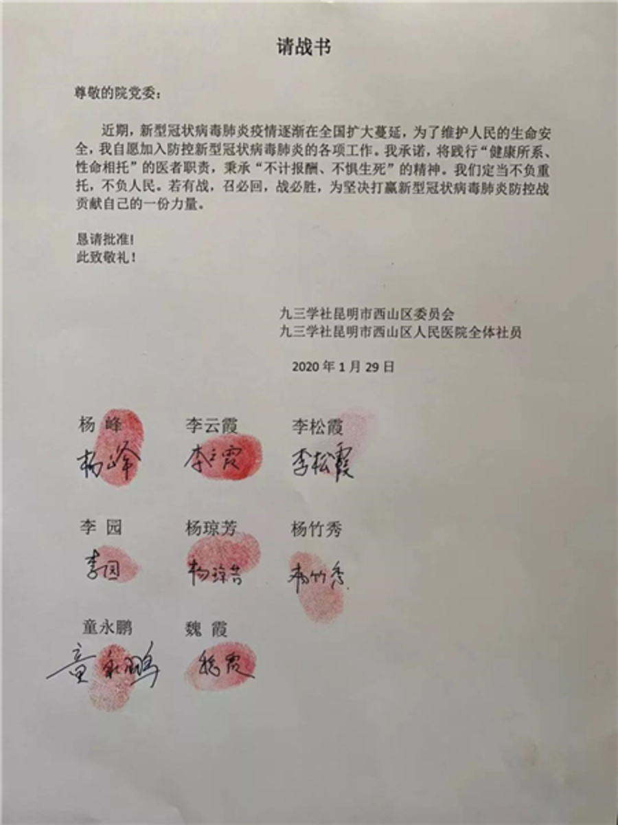 社西山區(qū)委西山區(qū)人民醫(yī)院全體社員請(qǐng)戰(zhàn)書及合影