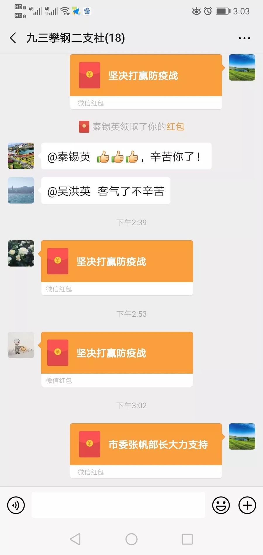 倡議書在微信群中發(fā)出后便得到了眾多社員的積極響應,微信紅包不停地在群中閃動,50元、100元、200元……,半天時間,34名社員共計捐款4340元。此筆捐款將用來為攀鋼集團總醫(yī)院密地院區(qū)發(fā)熱門診一線醫(yī)務工作者的提供午餐。