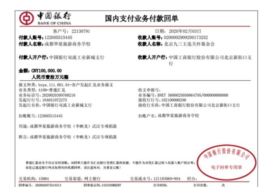 2月3日一早,九三王選關(guān)懷基金收到一筆10萬元的捐款,捐贈方署名:成都華夏旅游商務(wù)學(xué)校。