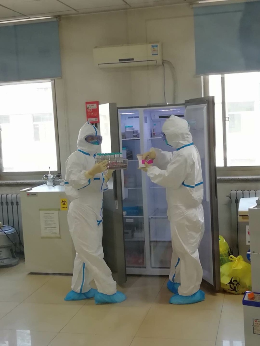 每次在實驗室進行檢測時,吳忠蘭和同事按照規(guī)范穿著厚重的防護服、鞋套、手套,佩戴N95口罩和護目鏡從生物安全柜中取出事先初步處理過的疑似病人樣本進行核酸提取。這個過程需要兩人一組默契配合,一人操作、一人協(xié)助,把病毒外面的殼進行破碎,將核酸從中提取出來,其間一絲不茍、精準(zhǔn)操作防止病毒“逃逸”,造成危險。然后將配置后的反應(yīng)體系放入實時熒光PCR儀器中進行核酸擴增反應(yīng)檢測,待反應(yīng)結(jié)束后,按照實驗室檢測規(guī)程判斷檢測結(jié)果。出實驗室后再用約半個小時小心翼翼脫下防護服進行消毒。整個實驗過程5、6個小時,其間不能上廁所,因此每次上崗前都盡量少喝水,工作結(jié)束后又渴又累,每個人臉上也留下口罩、護目鏡的壓痕。