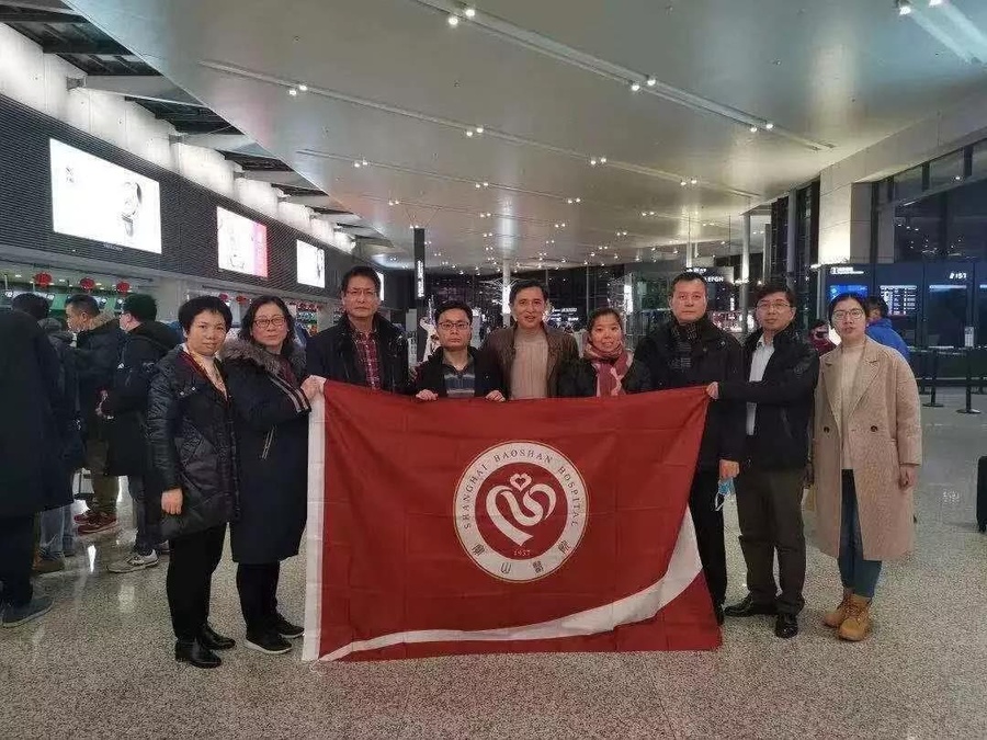 趙波醫(yī)生(右五)和送行的院領(lǐng)導(dǎo)、同事等
