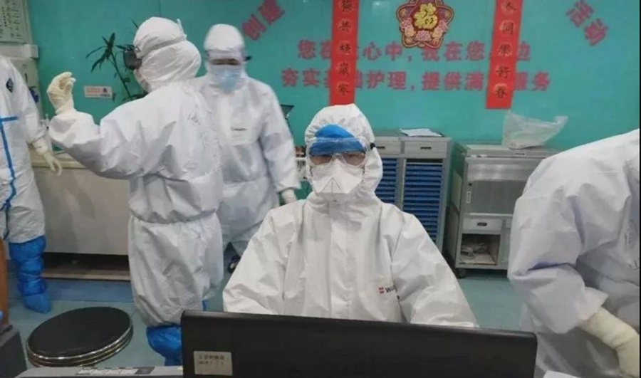 五院的幾位醫(yī)生已經在醫(yī)生辦公室了,經我們領隊與五院交談后,辦公安排在三樓清潔區(qū)。我和徐立新主任分配了20床至27床病號,五院雷醫(yī)生和我們交待了問診流程及主要關注的事項,指出問診主要采用表格式問診。我們進入病房,病房的病人大多在50歲以上,多數有咳嗽癥狀。我們逐一問診,整個過程持續(xù)了一個多小時。我和徐立新主任返回醫(yī)生辦公室時,已經是凌晨三點左右。離開隔離病房返回緩沖區(qū)脫防護服,脫的過程很艱辛,大概花費了近三十分鐘。