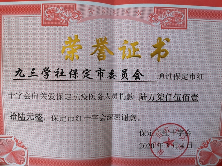 證書和票據(jù)的背后凝聚著社員們戮力同心、共克時(shí)艱的強(qiáng)大力量和必勝決心。愛心還在繼續(xù)......不同領(lǐng)域、不同行業(yè)、不同崗位上的九三人共同努力著!我們堅(jiān)信,在中國共產(chǎn)黨的領(lǐng)導(dǎo)下,在全國人民的共同努力下,我們必將贏得抗擊新冠肺炎疫情的最終勝利!